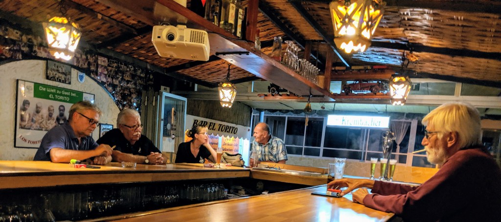 Els parroquians d’en Rainer van arribant a poc a poc al bar. Solen passar els vespres jugant a daus i fumant tabac negre que alternen amb cervesa i qualque xispeta d’herbes mallorquines, una de les poques concessions als productes locals. En el bar encara es pot fumar perquè que aquell local hagi sobreviscut a vint anys de turisme de tot inclòs mereix algun privilegi. Són els seus “drets històrics adquirits”, com li agrada bravejar a en Rainer. Les converses mai no són massa profundes, i de tant en tant es conten acudits: jocs de paraules i anècdotes d’humor senzill perquè entre ells no es volen ofendre. Sense dir-se res tots han acordat no aprofundir ni en les seves vides ni en cap tema perquè saben ben bé que conèixer massa a algú acaba, irremissiblement, portant al dolor o a l’enfrontament. Si arribes tot sol en dia feiner i de vespre a un bar en un país estranger és perquè escapes d’algun lloc o d’algú, no vols intimar ni conèixer gent nova. El que la gent cerca en aquests bars és un ambient de tolerable companyia. De forma implícita, entenen que en la superfície de les relacions interpersonals està la clau per una harmònica convivència.